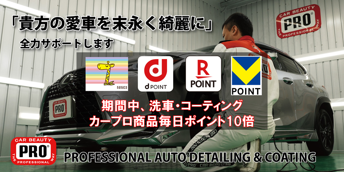 期間中、コーティング・洗車・防錆コートなど、全てのカープロ商品において毎日ポイントを10倍進呈いたします。