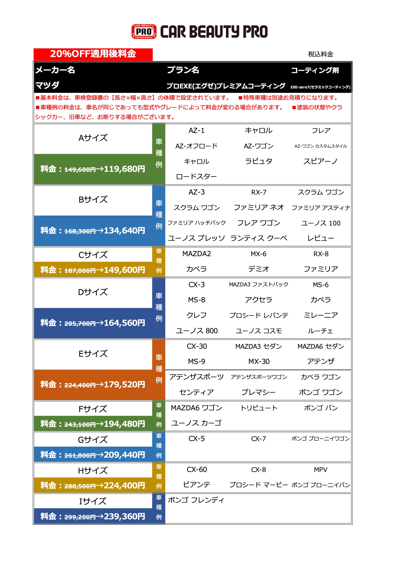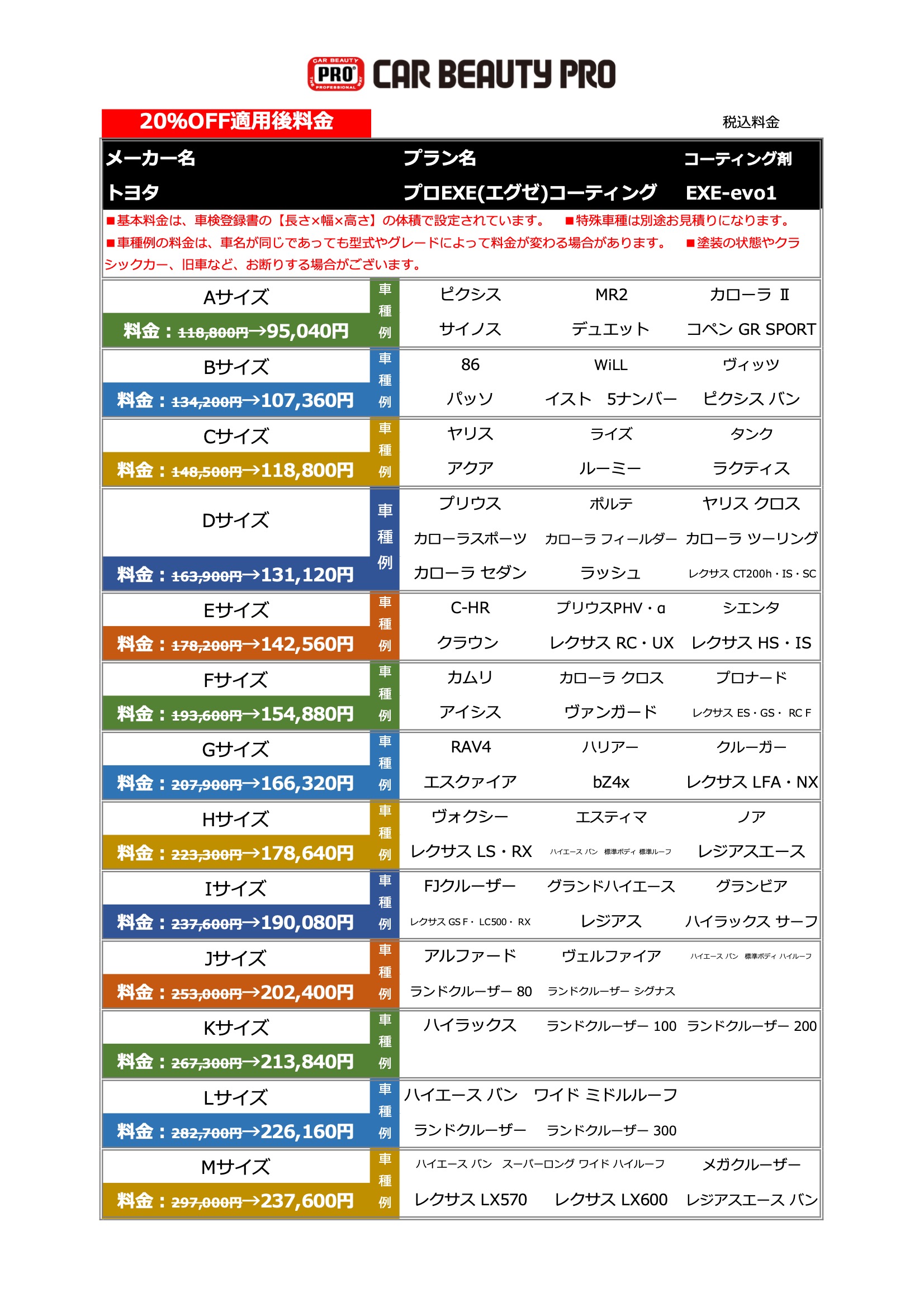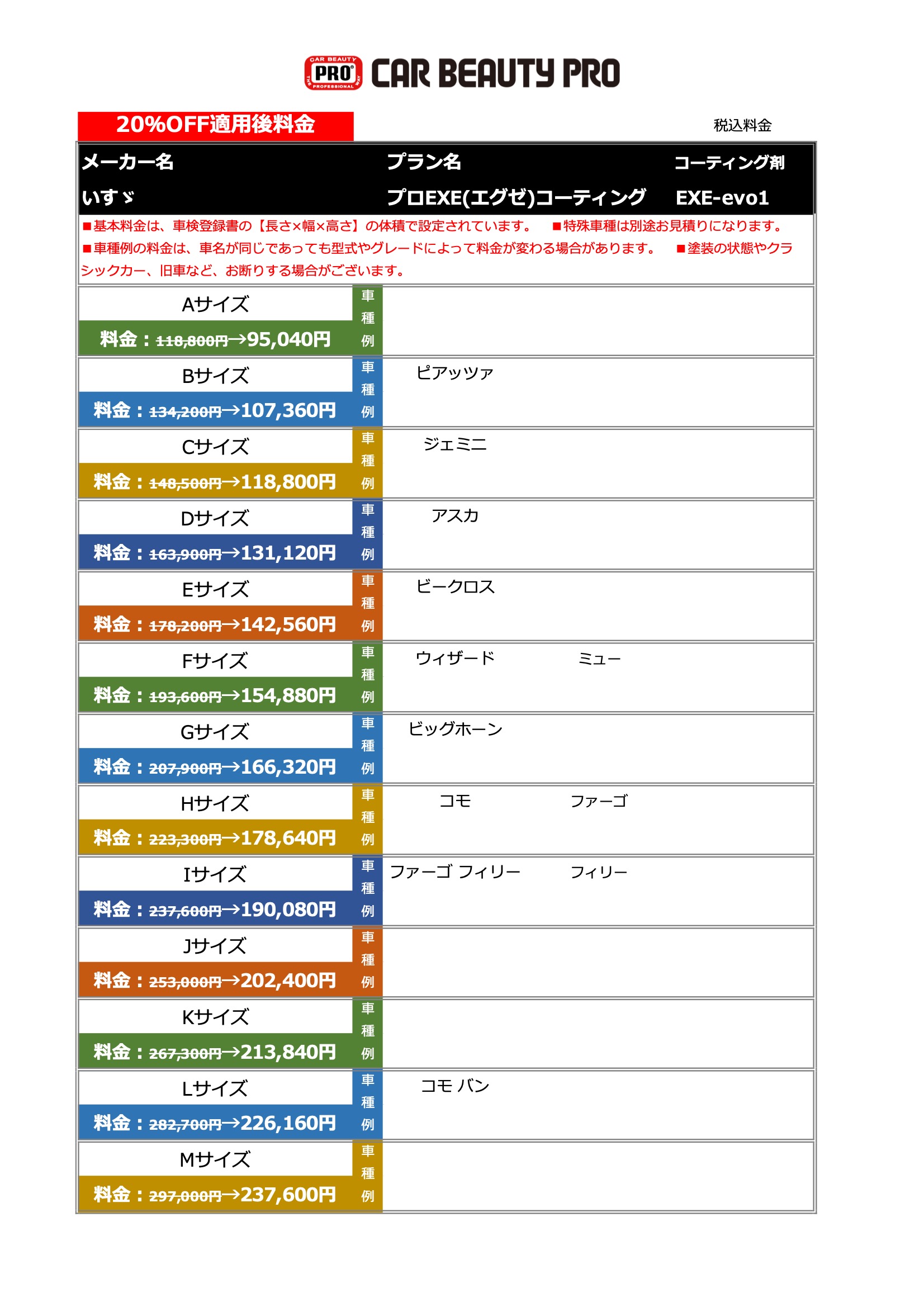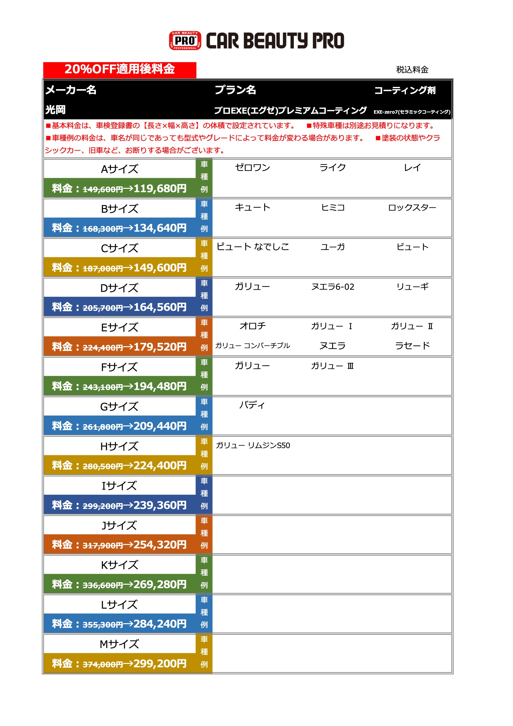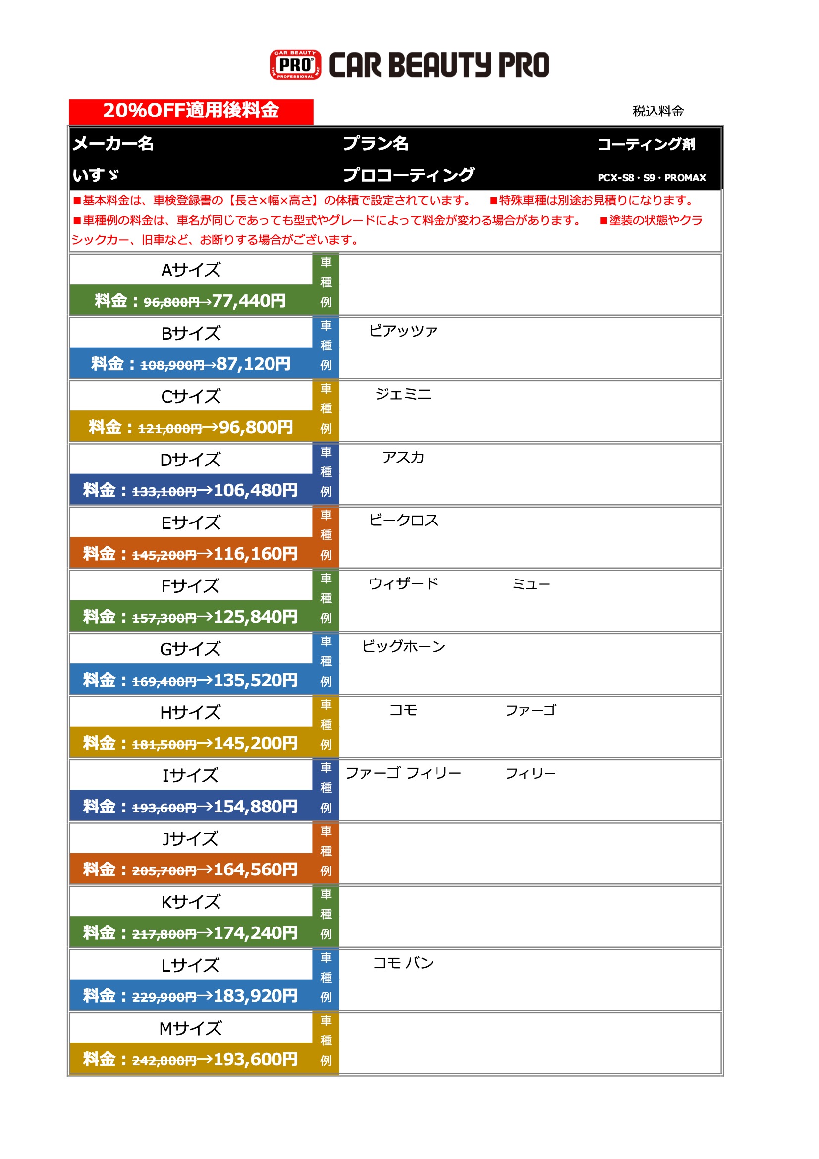 サービスの種類をお選びください プロコーティングプロEXE(エグゼ)コーティングプロEXE(エグゼ)プレミアムコーティングプロルームクリーニングプロ防錆コート(アンダーコート)プロ防錆コート(ボディコート)プロ防錆コート(フルコート)