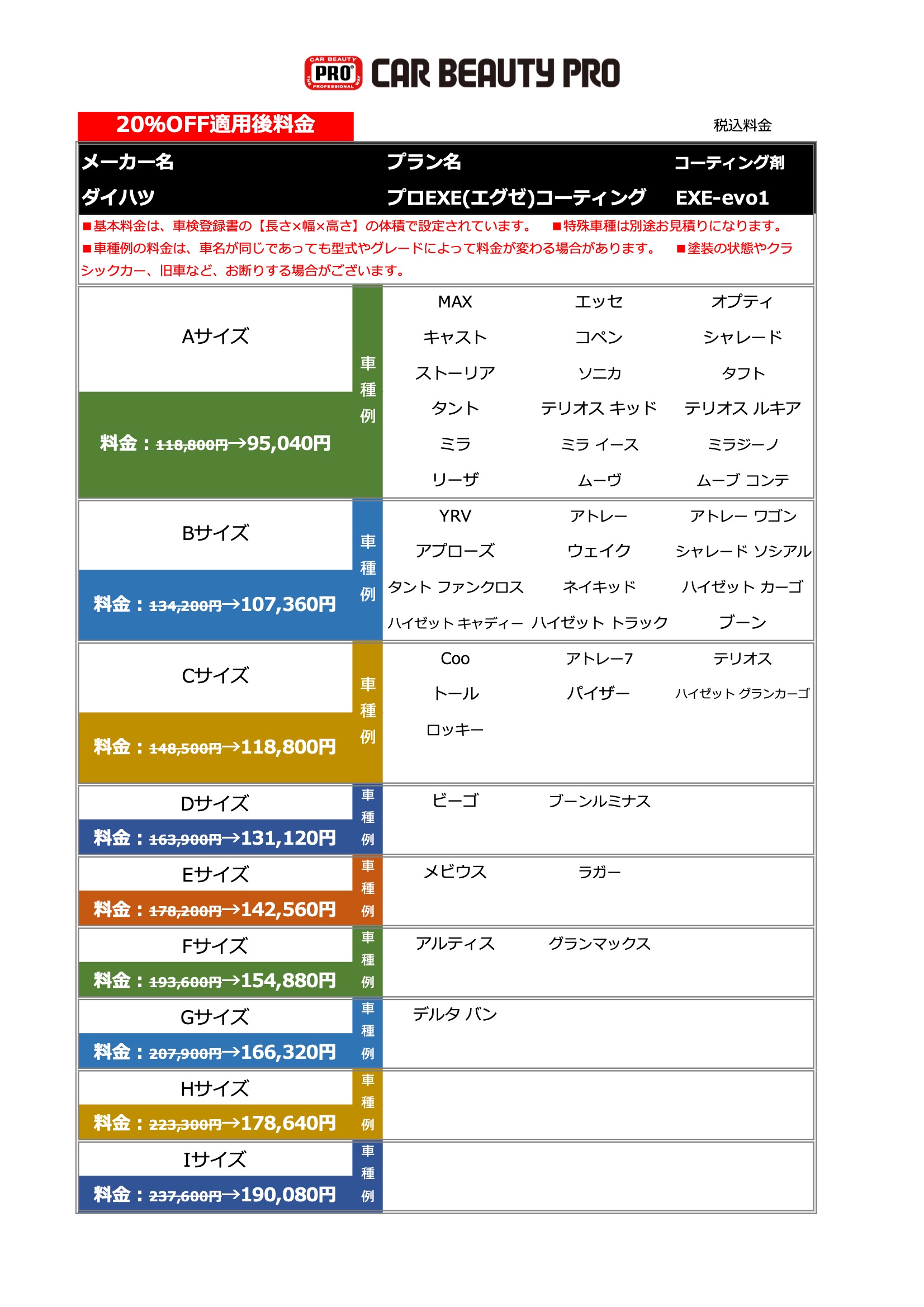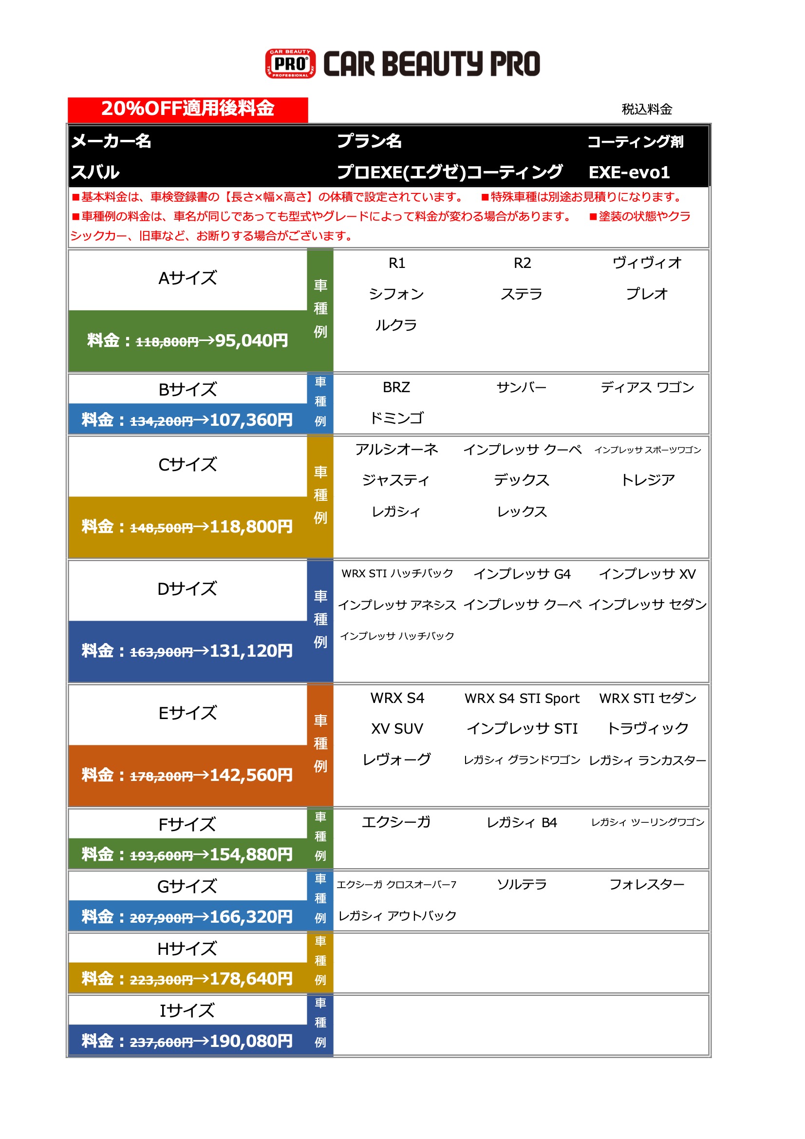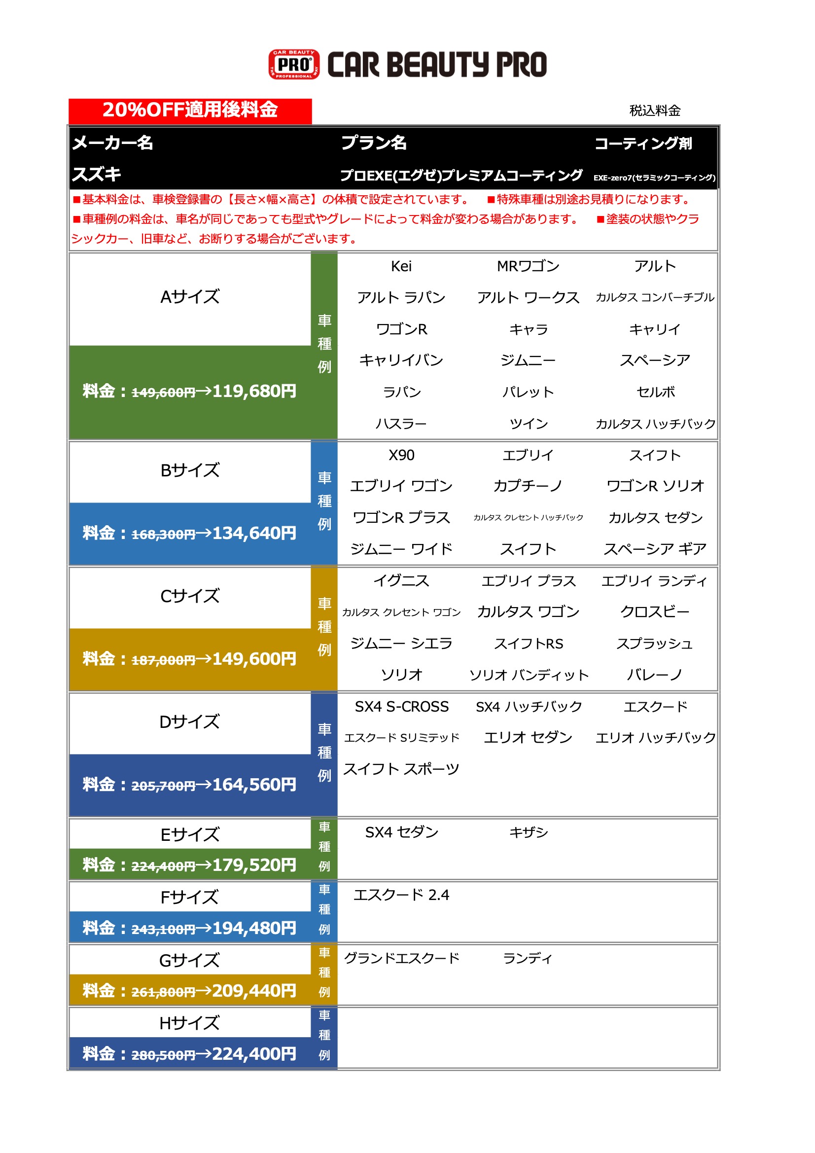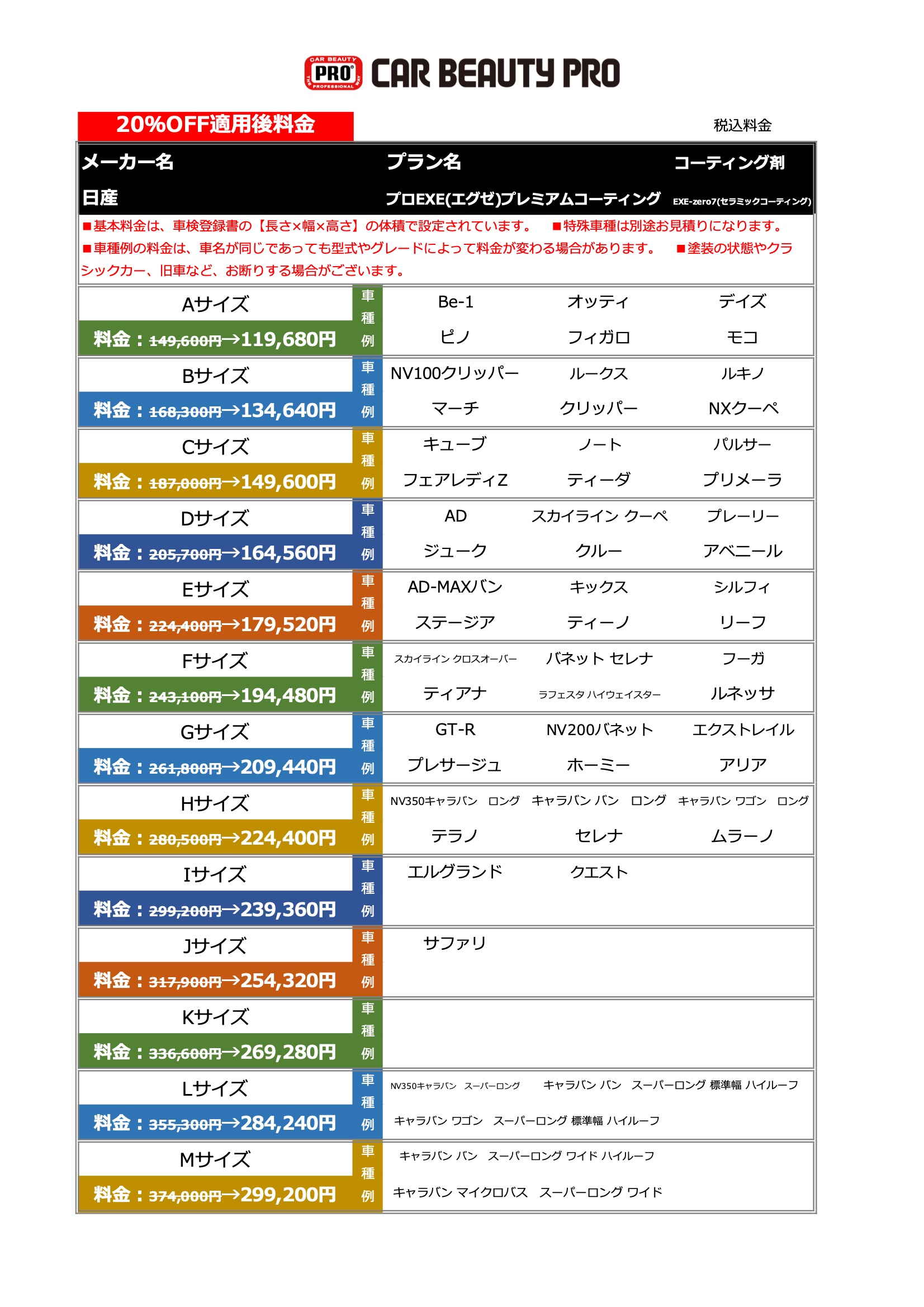 サービスの種類をお選びください プロコーティングプロEXE(エグゼ)コーティングプロEXE(エグゼ)プレミアムコーティングプロルームクリーニングプロ防錆コート(アンダーコート)プロ防錆コート(ボディコート)プロ防錆コート(フルコート)