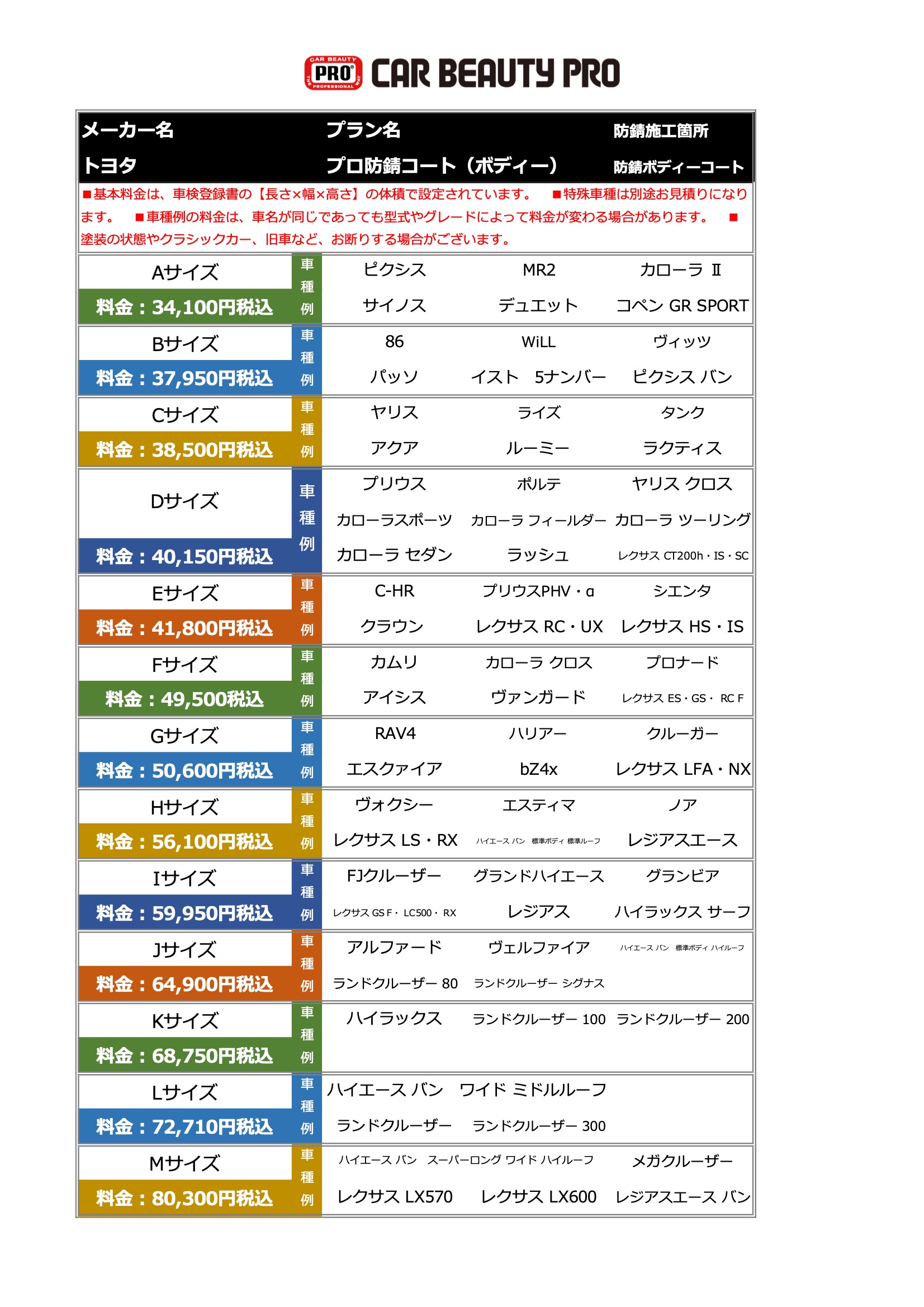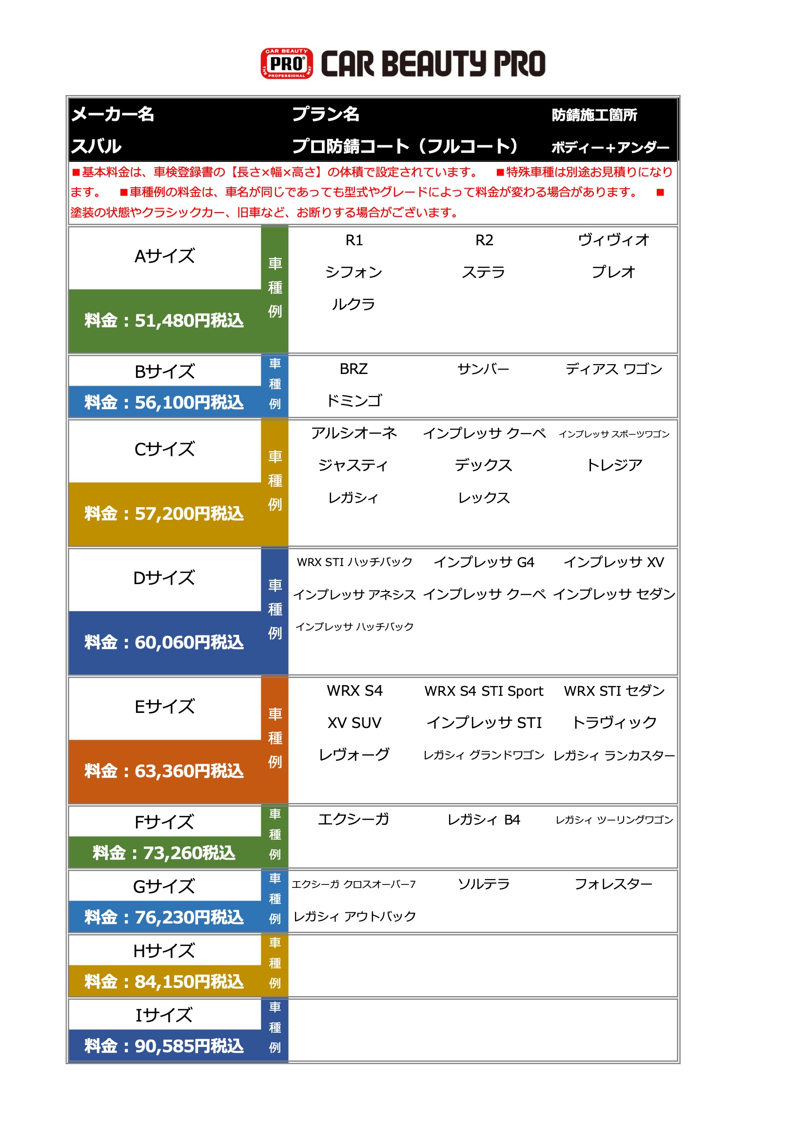 サービスの種類をお選びください プロコーティングプロEXE(エグゼ)コーティングプロEXE(エグゼ)プレミアムコーティングプロルームクリーニングプロ防錆コート(アンダーコート)プロ防錆コート(ボディコート)プロ防錆コート(フルコート)