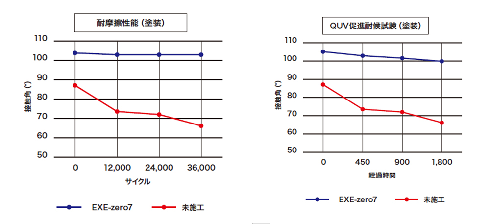 12,000サイクル(往復)ごとに水の接触角を測定する摩擦耐久性試験では36,000サイクル後の接触角は102度を維持し、施工直後と比べてもわずか0.6度のみの減少でした。さらに、QUV促進耐候では施工から1,800時間経過後には撥水角が、未施工と比べて30度以上の差を実証しました。